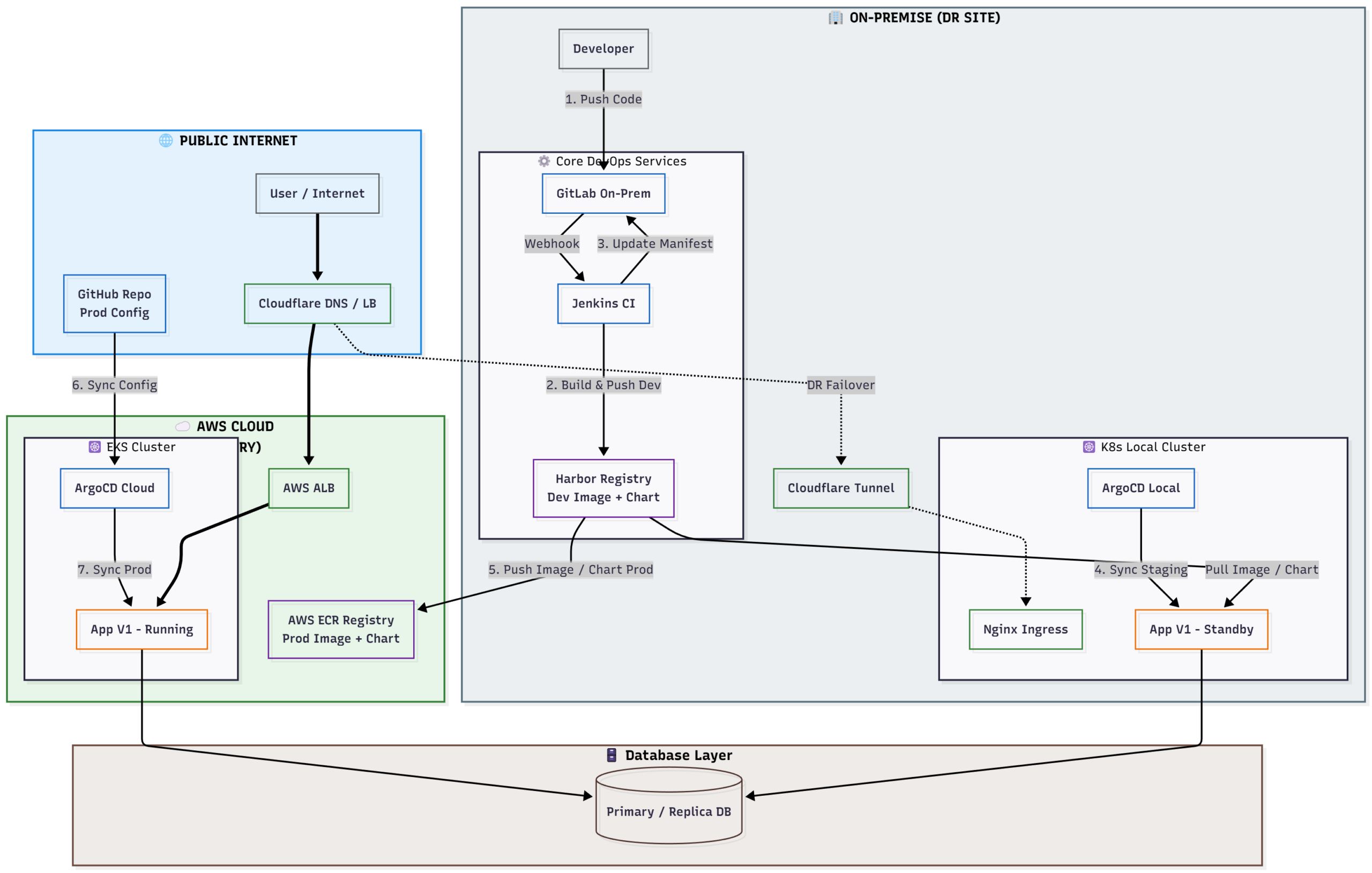 - Hệ thống chính (Primary) chạy trên Cloud (AWS EKS) để phục vụ khách hàng toàn cầu với tốc độ cao.