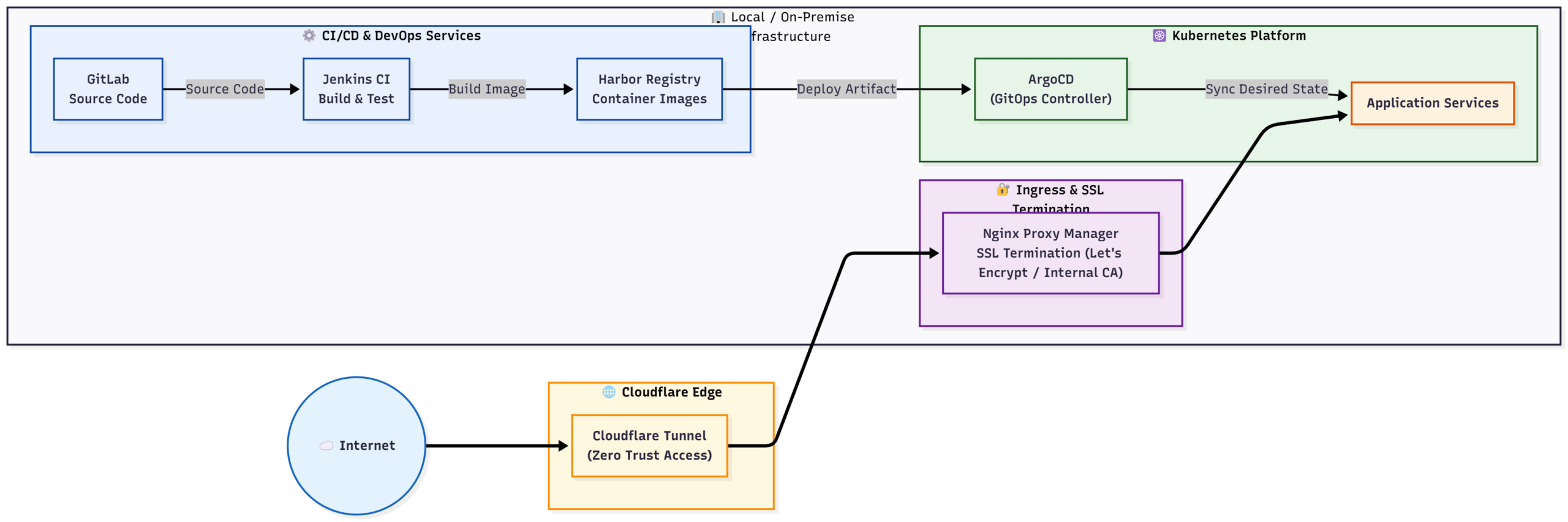 - Jenkins update manifest trên GitLab -> ArgoCD Local sync về K8s Local.