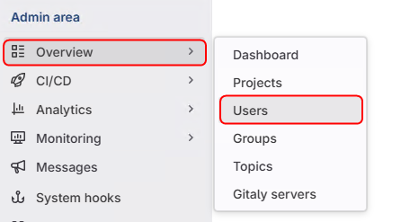 – Truy cập vào giao diện Admin để quản lý gitlab. Hãy nhập vào biểu tượng cờ lê và có chứ Admin Area để vào giao diện Admin