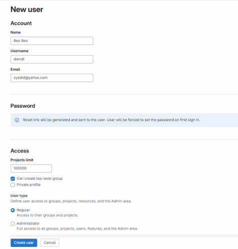 – Đổi mật khẩu cho tài khoản root. Khi đăng nhập lần đầu tiên vào gitlab, hệ thống sẽ yêu cầu bạn đặt lại mật khẩu cho tài khoản admin (mặc định là root)