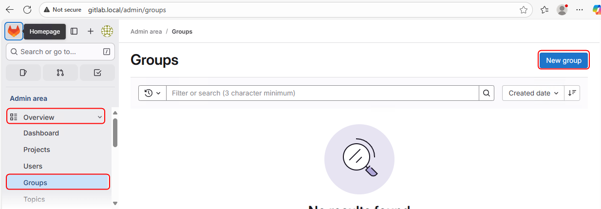 Trong Admin Area hoặc ở màn hình chính, Overview -> Group nhấp vào nút New group.