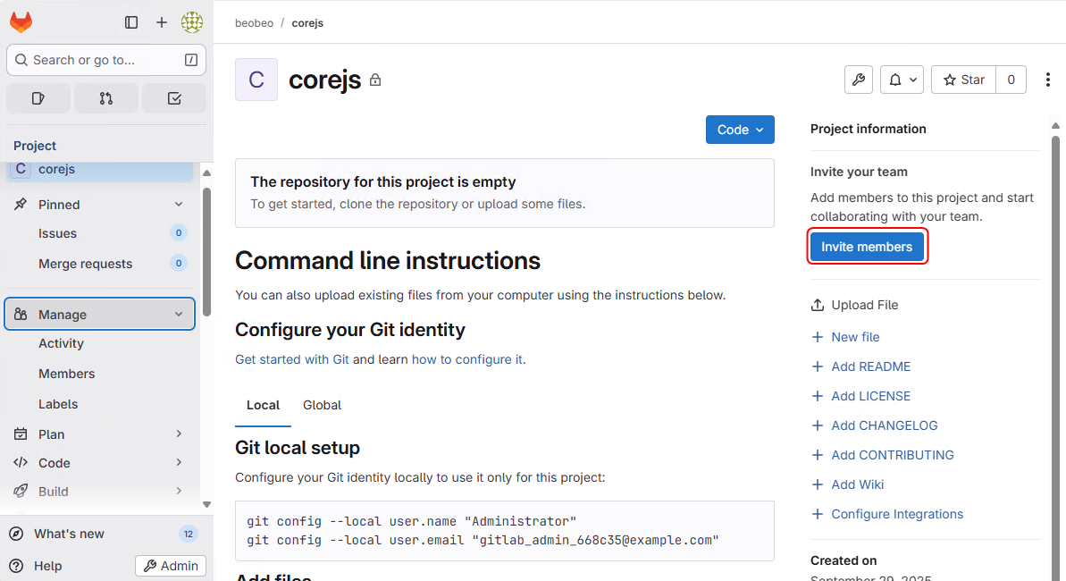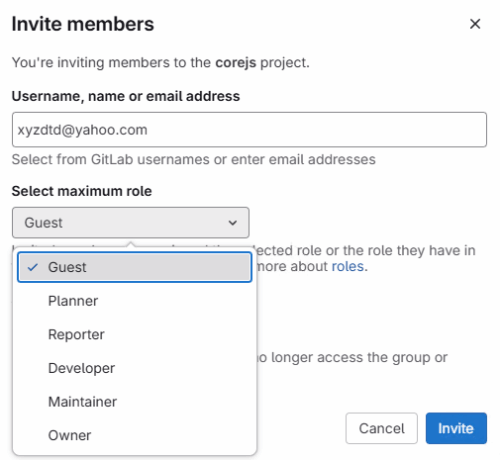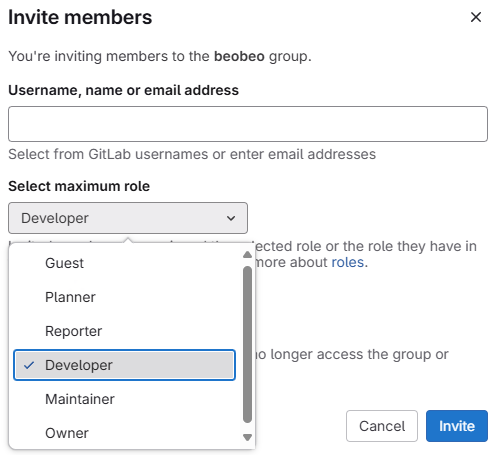 Chọn quyền truy cập (role) cho người dùng đó (ví dụ: DeveloperMaintainerOwner).