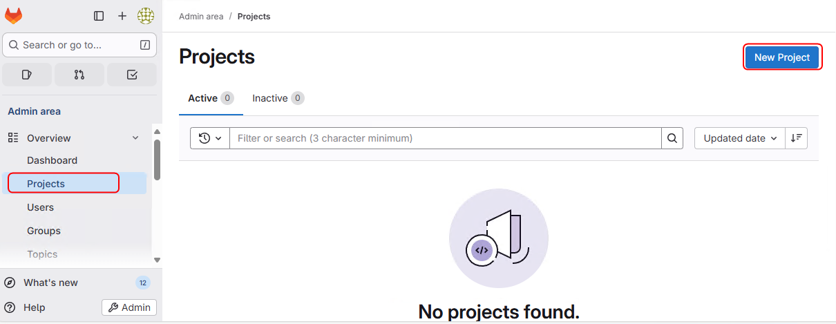 Ở màn hình Admin Area, Overview -> Projects nhấp vào nút New project.