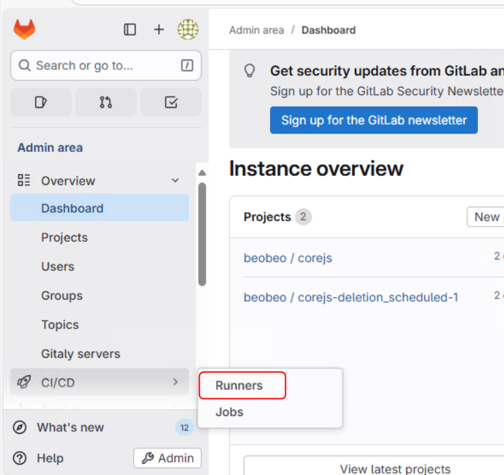 Đăng nhập vào GitLab và đi đến: Admin Area > CI/CD > Runners.