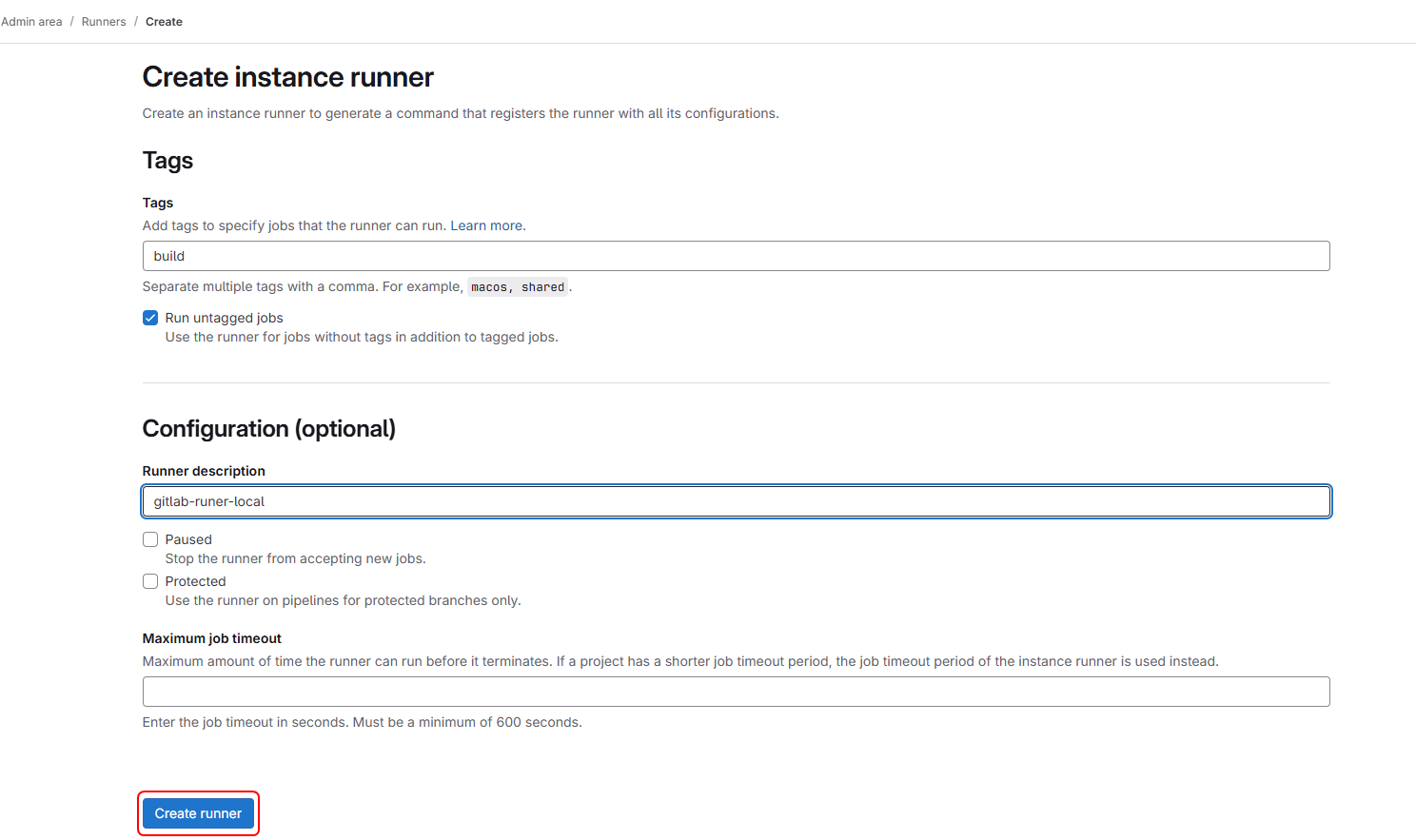 Tại đây, bạn nhập tags, Descriptions và bấm Create Runner