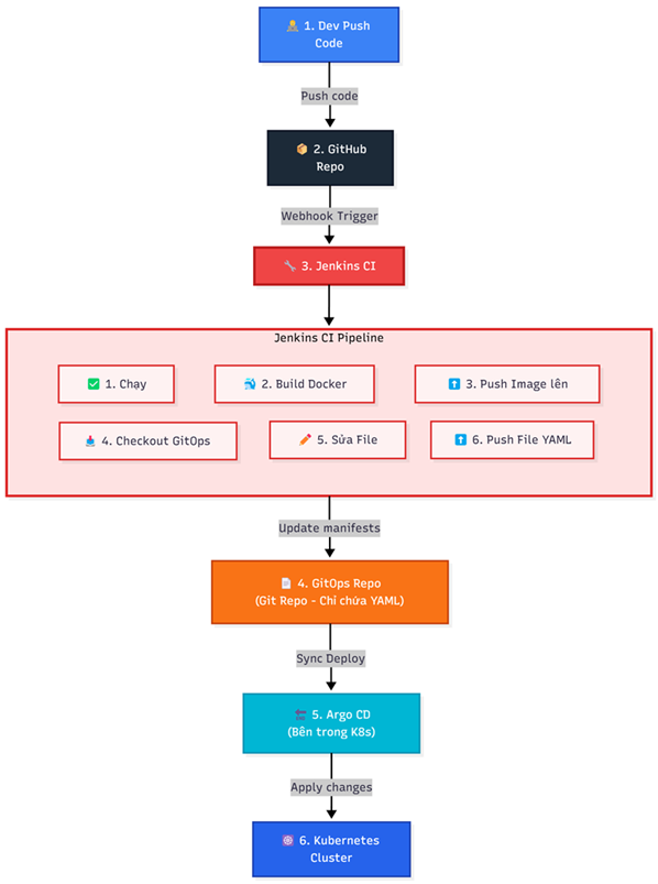 - Jenkins (CI): Hoàn thành vai trò CI, checkout một repo khác (repo GitOps) và chỉ sửa 1 dòng