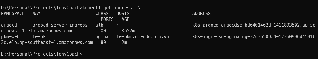 Lấy địa chỉ của Nginx Ingress Controller bằng lệnh kubectl get ingress -A