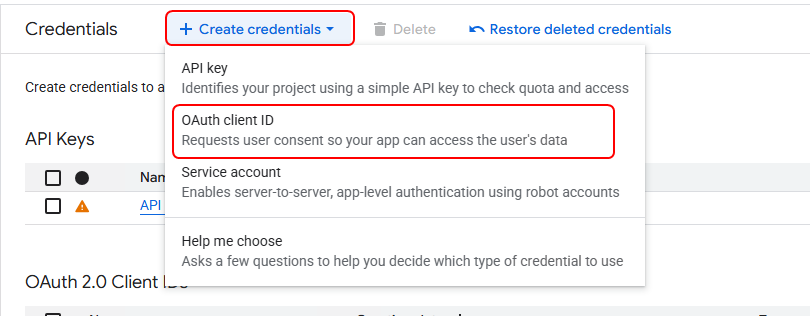 – Nhấn nut + CREATE CREDENTIALS và chọn OAuth client ID từ mục Dropdown