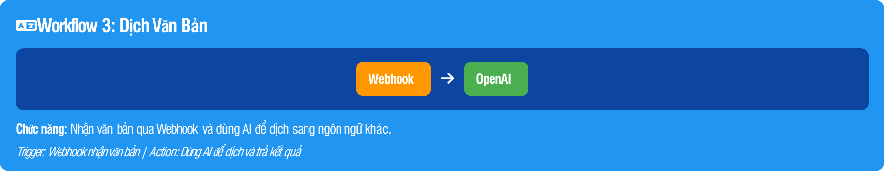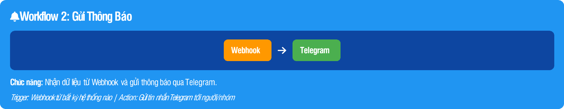 • Event/Webhook: Kích hoạt bằng sự kiện (Event-based/ Webhook): Hoạt động theo thời gian thực khi có sự kiện xảy ra. Không tốn tài nguyên chờ đợi, chỉ chạy khi có sự kiện xảy ra. Dịch vụ bên ngoài tự đọng gửi dữ liệu đến một URL đặc biết của n8n.