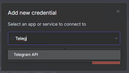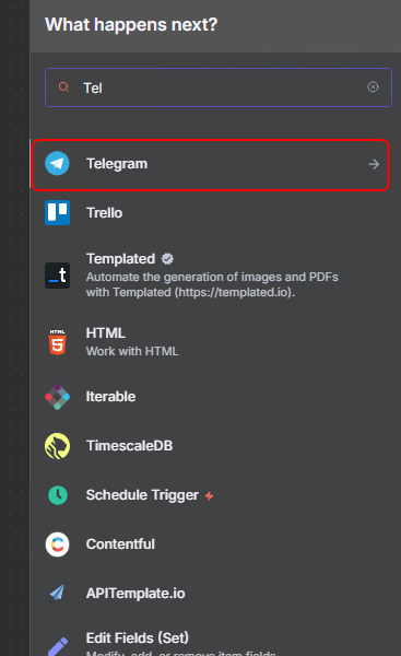 • Tìm kiếm “telegram” và chọn “Telegram Trigger”