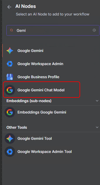 • Tim “Gemini” và chọn “Google Gemini Chat Model”