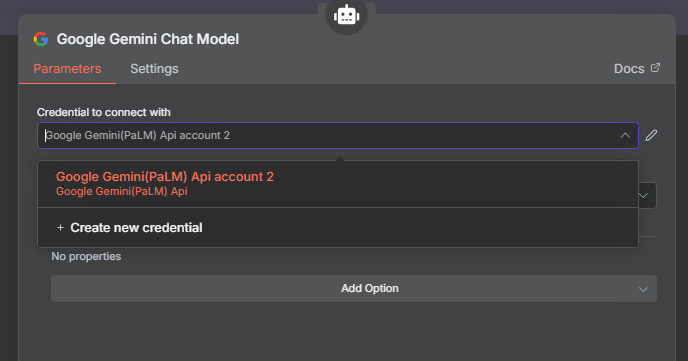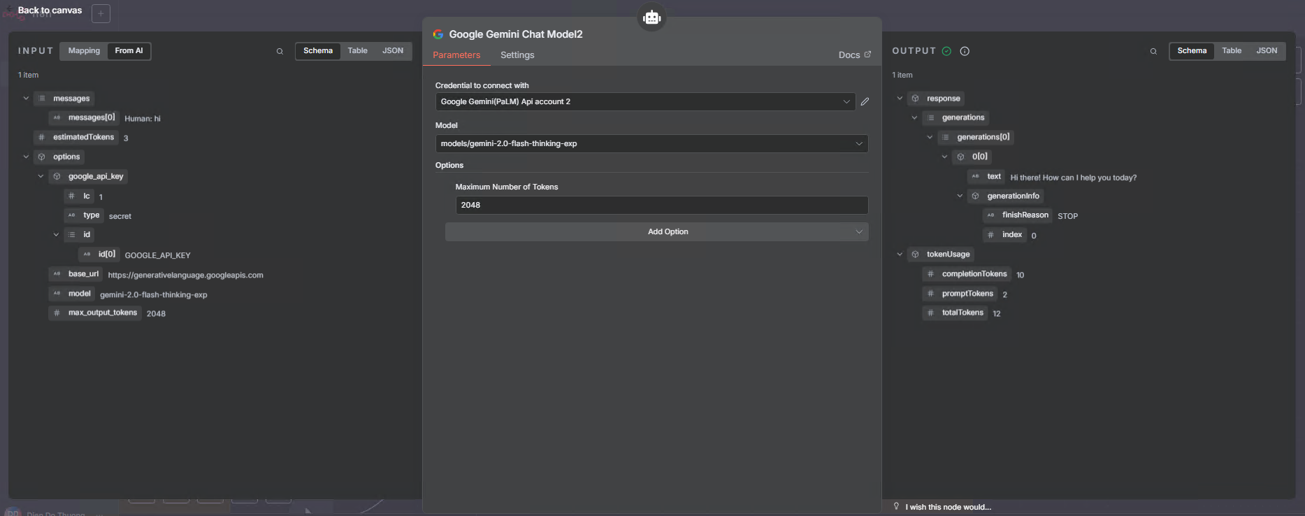 • Bấm vào Google Gemini Chat Model và nhập Credentials, chọn model model/gemini-2.0-flash-thinking-exp