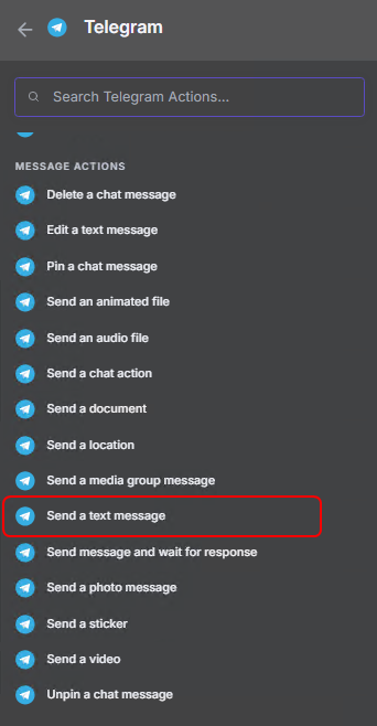 • Tìm kiếm “Telegram” và chọn “Send a text message”
