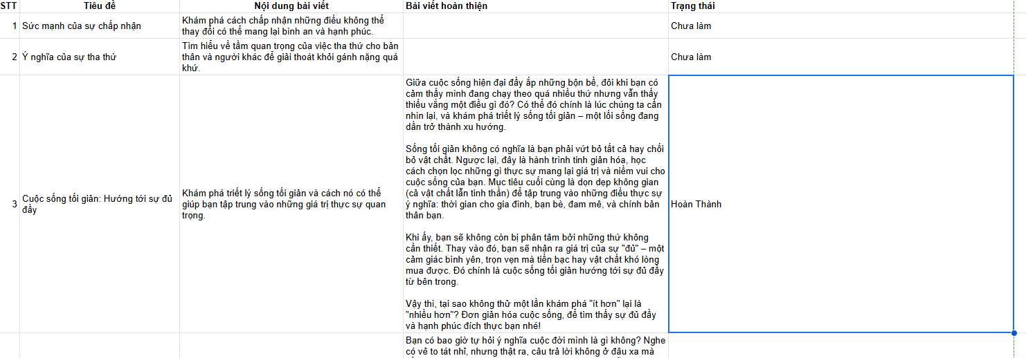 Mục tiêu: Lấy danh sách chủ để từ Google Sheet, dùng AI để viết bài cho mỗi chủ đề