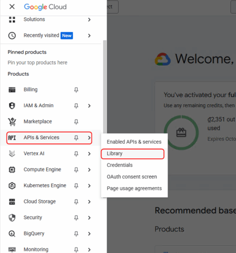 – Từ menu bên trái chọn “APIs & Serivce” > “Library”