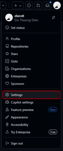 Tạo Personal Access Token để login. Vào GitHub -> Bấm vào Avatar -> Setting