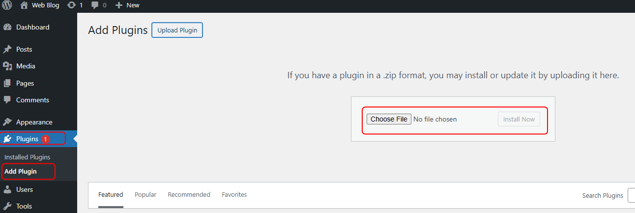 Vào Menu Plugin -> Add Plugin -> Upload Plugin