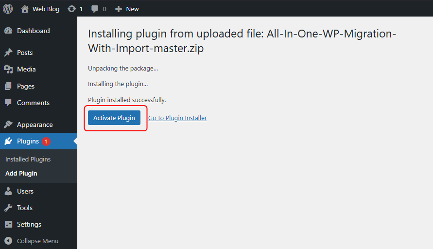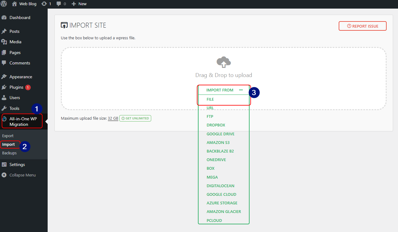 Activate Plugin. Sau khi Activate Plugin tiến hành import site. Vào All-in-One-WP-Migration -> Import -> File