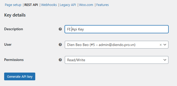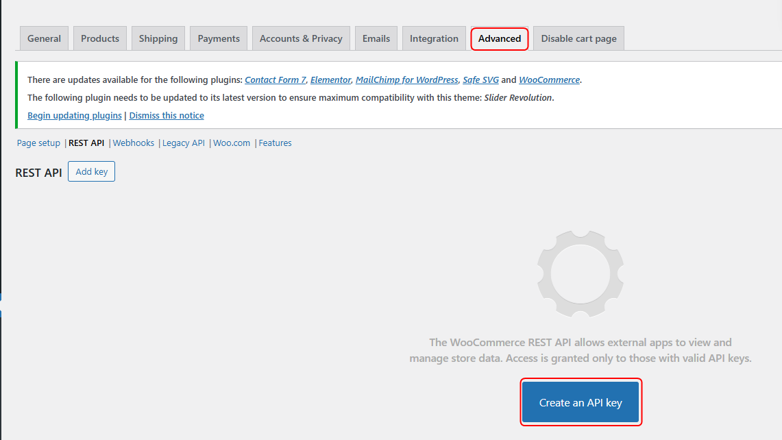 Đăng nhập vào Quản trị WordPress, đi đến WooCommerce -> Settings -> Advance -> REST API