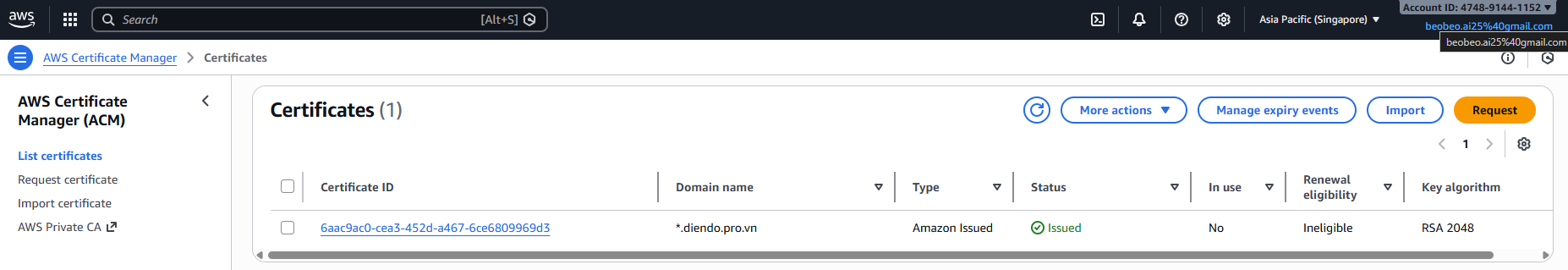 Tại Cert Manager bạn sẽ lấy ARN để chuẩn bị cho phần lab bên dưới.