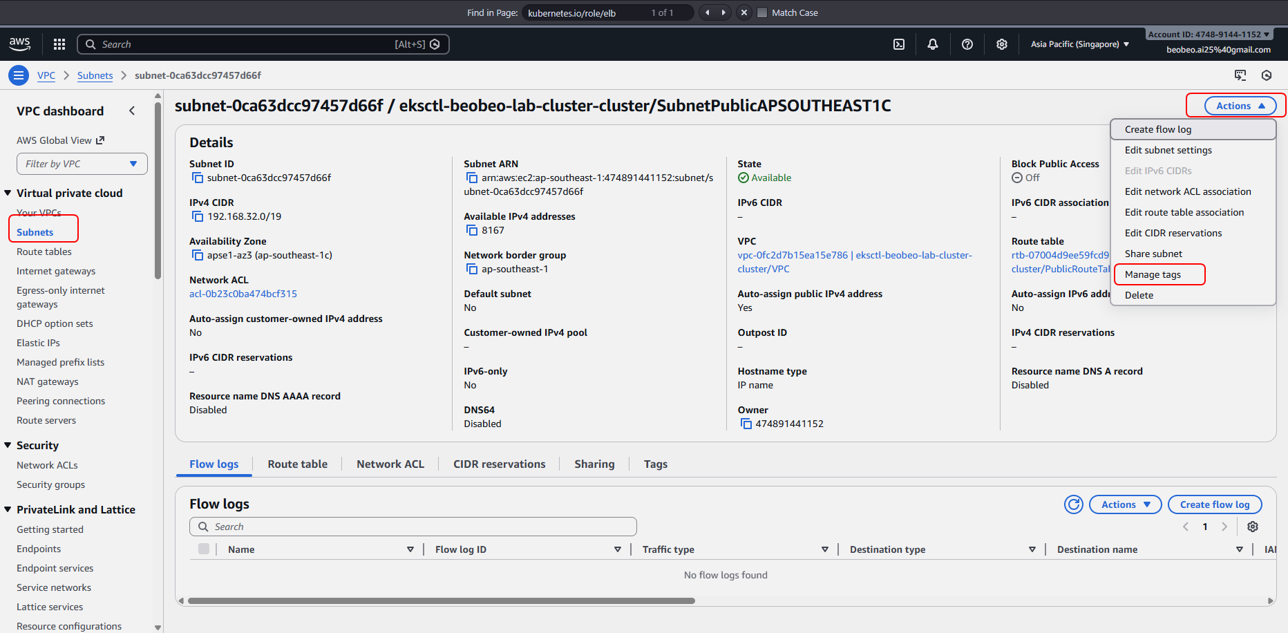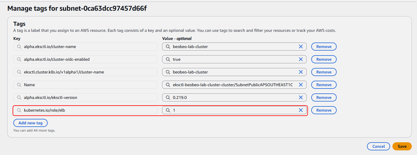 – Sau đó bạn kiểm tra xem đã có tag kubernetes.io/role/elb với Value: 1 chưa. Nếu chưa có thì bấm và Add New tag và add tag đó vào. Như ở bên dưới mình đã add tag rồi.