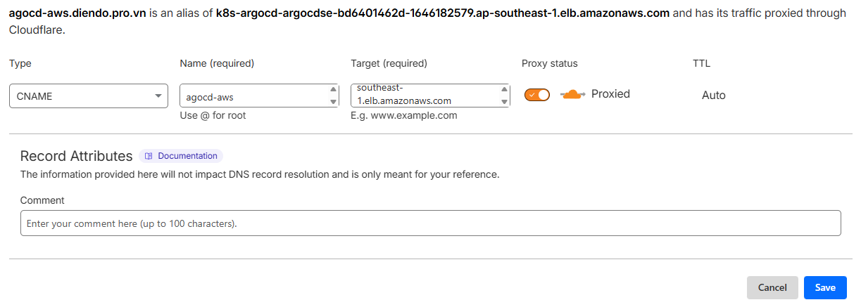 Để public App bằng domain, ta add CNAME trong Cloudflare như sau:
