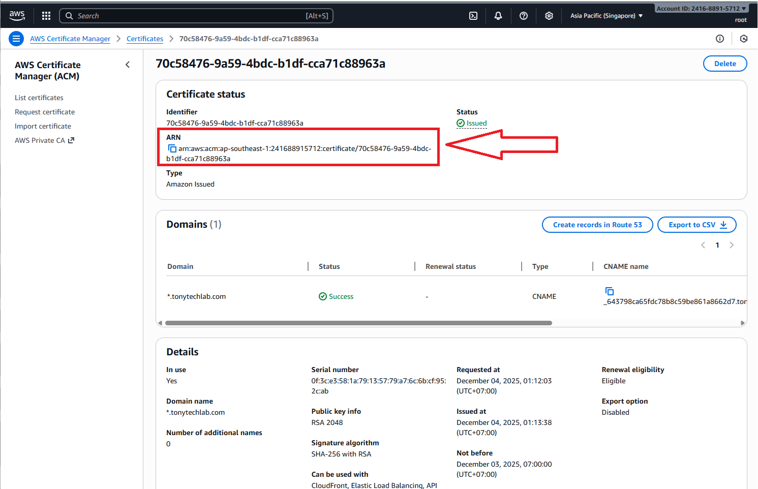 Tại Cert Manager bạn sẽ lấy ARN để chuẩn bị cho phần lab bên dưới.