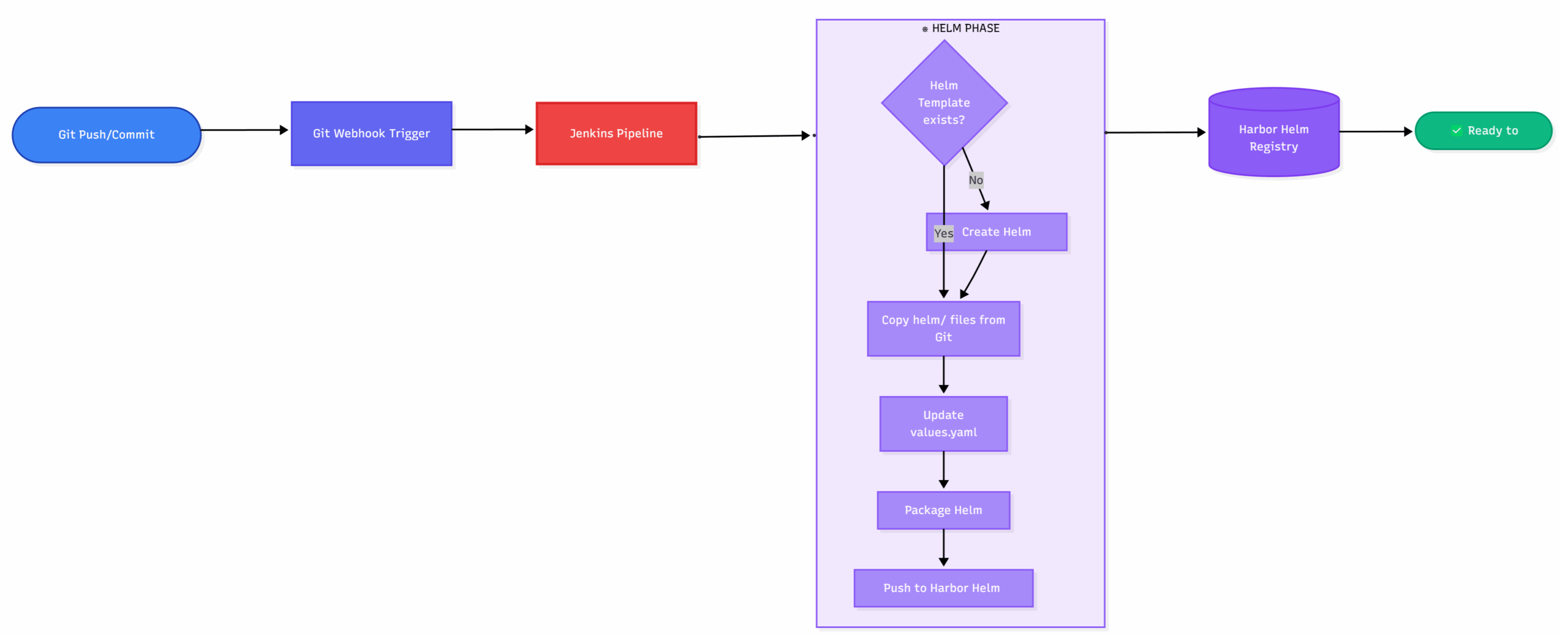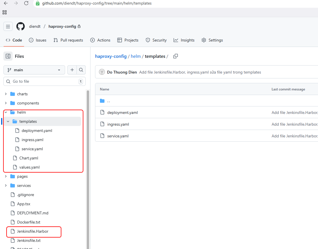 Sau đó tiếp tục tạo Helm Template nếu chưa có -> và tiến hành đưa các nội dung của template dành riêng cho dự án từ thư mục helm ở trên git đưa vào values và template -> Đóng gói helm lại -> Push lên Helm Harbor Registry.