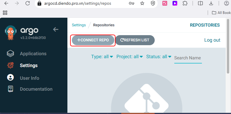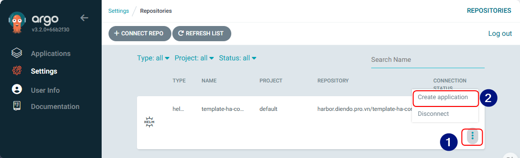 Tại phần Repo đã tạo thành công ta bấm vào dấu 3 chấm -> Create application.